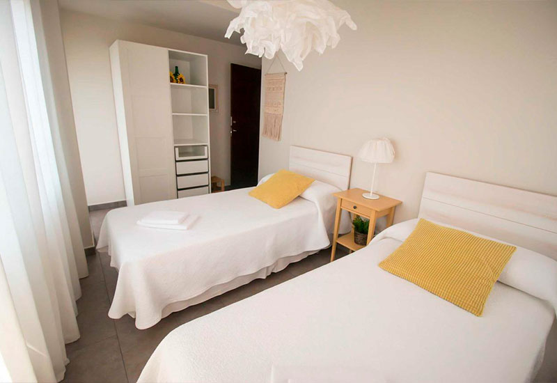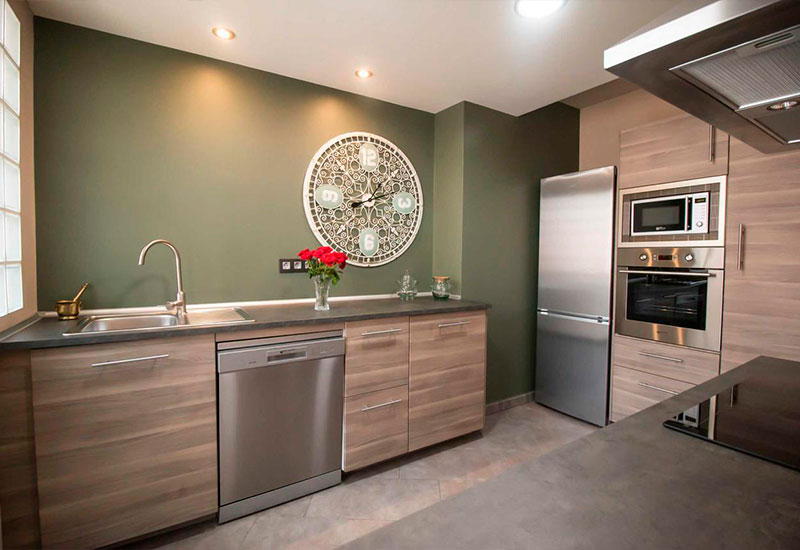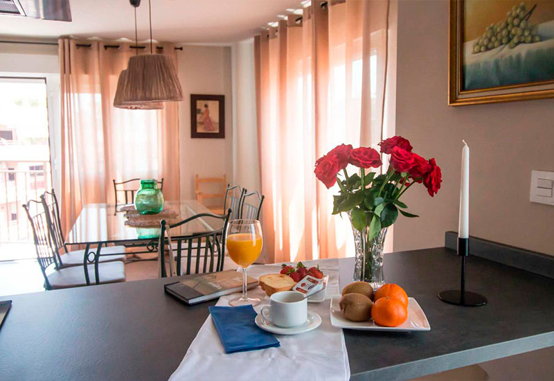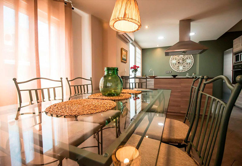 El apartamento cuenta con 3 dormitorios (uno de ellos con baño privado), 2 baños con bañera o ducha, un salón-comedor espacioso y una cocina moderna con isla central equipada con lavavajillas, microondas, horno y cafetera. Además, dispone de WiFi gratuita, aire acondicionado, TV de pantalla plana y reproductor de DVD.
